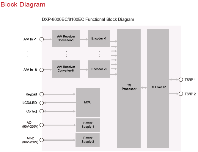 - Tín hiệu truyền hình có thể được đưa vào DXP-8000EM qua 8xHDMI hoặc 8 x CVBS sau đó được đưa ra trên TS/IP cổng RJ45.