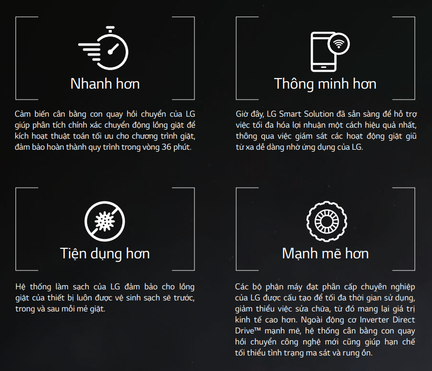 Thể tích lồng giặt lên đến 150L, tốc độ tăng cường và thiết kế xếp chồng độc quyền của LG cho phép người dùng giặt được nhiều hơn trong thời gian ít hơn.