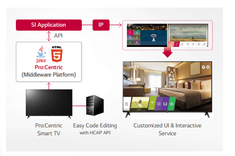 Include Pro: Centric - Hotel Management Solution: Pro:Centric SMART is optimized for customizing hospitality services for hotel brands and guests through an IP & RF infrastructure. With its high picture quality, sophisticated design, and advanced connectivity functions, it upscales in-room entertainment and enhances convenience through high-end technology.
