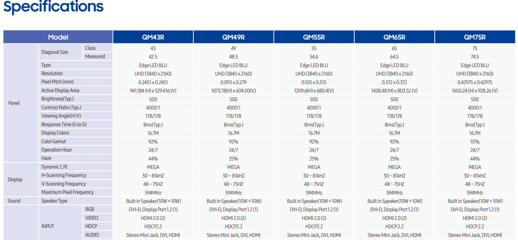 Kích thước: 43''/49''/55''/65''/75'' Độ phân giải: 3840x2160(4K UHD) Độ sáng: 500 nit