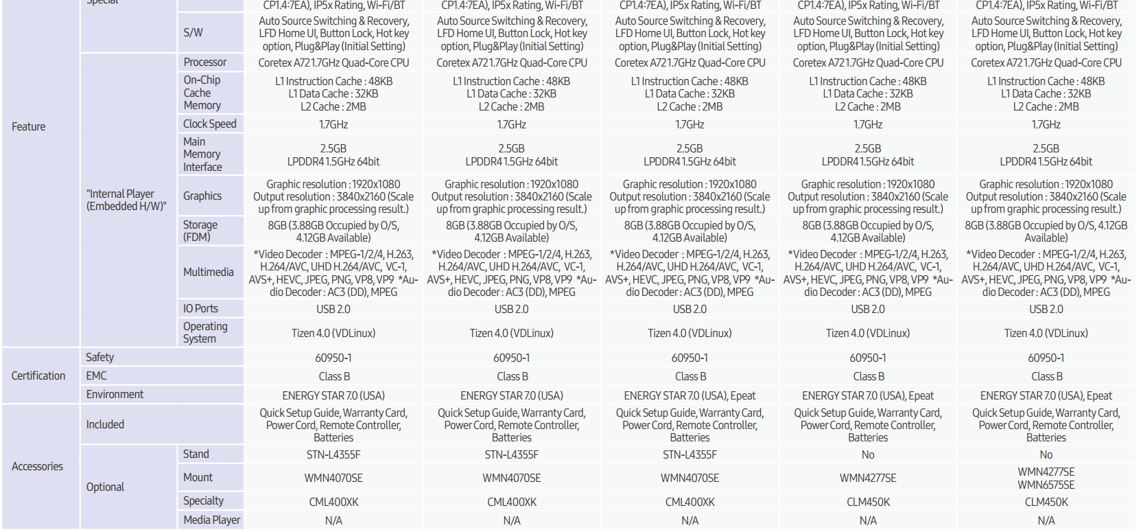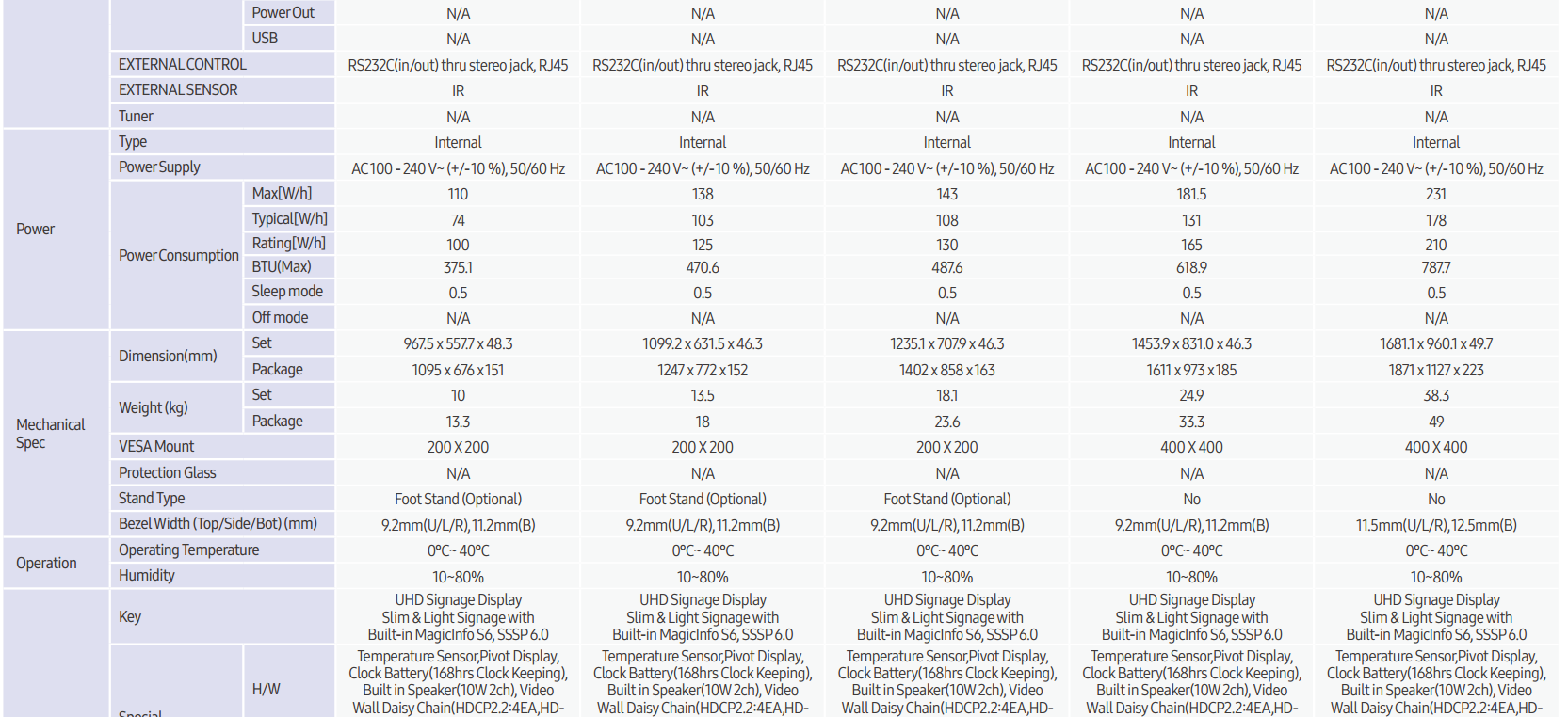 - Hỗ trợ hoạt động 24/7 - Màn hình UHD, độ sáng 500 nit - Quản lý nội dung với MagicInfo - Hệ điều hành Tizen 4.0 mạnh mẽ - Kết nối wifi và Bluetooth - Kích thước: 43''/49''/55''/65''/75''