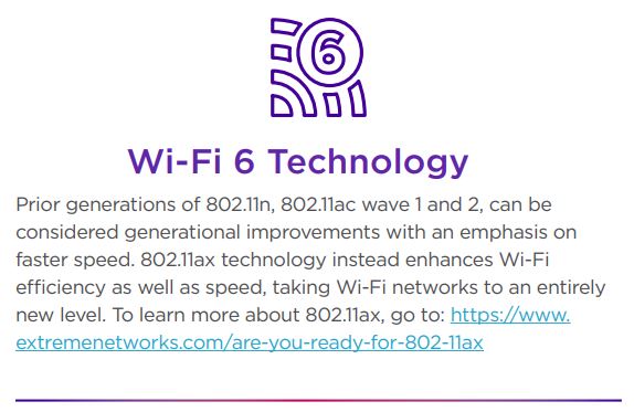 The AP305C/CX are indoor enterprise APs based on a new system-on-a-chip (SoC) with two built-in dual-band radios providing the best value with Wi-Fi 6 high efficiency. The AP305C/CX platforms are the first generation of APs to run multiple Extreme operating systems, providing flexibility and choice of onpremise or cloud deployment, while minimizing total cost of ownership. You have your choice of models with either integrated or external antennas. Advanced radio technology delivers 802.11ax 2x2:2 data rates up to 2.4 Gbps concurrently on both the 2.4 GHz and 5 GHz radios. These 2x2:2 APs continue the Extreme tradition of software-selectable radios (SSRs) capable of dual 5 GHz connectivity for indoor and industrial environments.