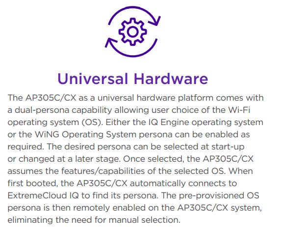 The AP 305C/CX is part of Extreme’s Universal Wi-Fi platform and provides users the choice of Wi-Fi operating system (IQ Engine or WiNG Operating System). Customers have the flexibility to select the OS at start-up or at a later stage and the AP will assume the features/capabilities of the selected OS. When first booted, the AP305C/CX automatically connects to ExtremeCloud IQ to find its persona. The pre-provisioned OS persona is then remotely enabled on the AP305C/CX AP and the user can stay in the cloud or select manage the device locally.