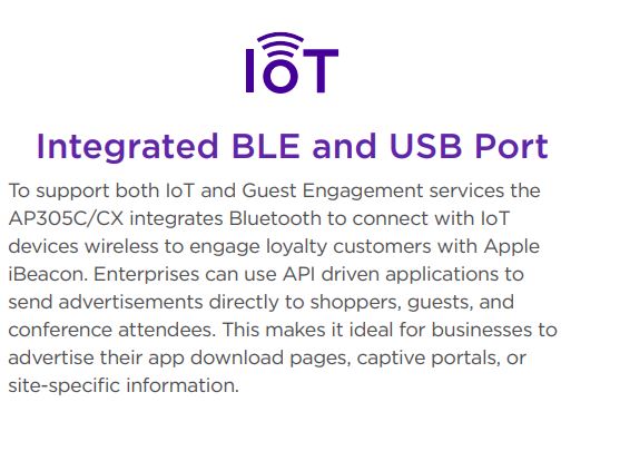 Despite the exponential growth of users, BYOD devices, IoT, high-bandwidth applications and security threats straining the infrastructure, the AP305C/CX combines performance, security services and insightful ML/AI management capabilities to deliver an enterprise class solution at a value price.