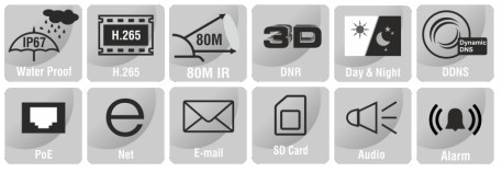 FEATURES Starlight Illumination 2.7-13.5 mm Motorized Lens Smart IR up to 80 m ONVIF Profile (S, G, T) Triple Stream Audio and Alarm Support PoE, IP67