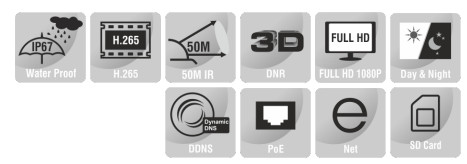 FEATURES Starlight Illumination 4 mmFixed Lens Smart IR up to 50 m ONVIF Profile (S, G, T) Triple Stream Built-in Mic PoE, IP67