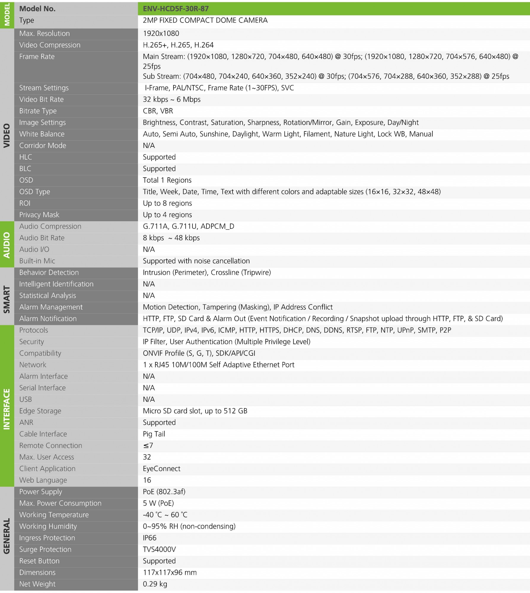 Camera ENV-HCD5F-30R-87 là một sản phẩm camera dome chất lượng cao được sử dụng trong các ứng dụng giám sát. Dưới đây là một số đặc điểm nổi bật của sản phẩm: