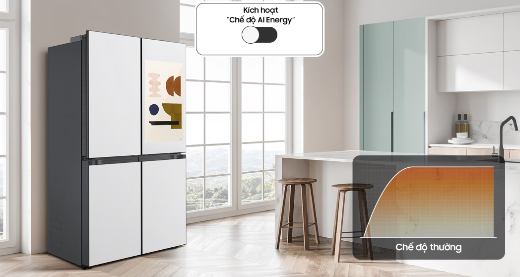Nếu hóa đơn tiền điện dự kiến vượt quá mục tiêu đặt trước, ứng dụng SmartThings sẽ nhắc bạn kích hoạt chế độ tiết kiệm điện AI Energy. Từ đó, tủ lạnh sẽ tối ưu tốc độ máy nén và chu kỳ rã đông dựa trên thói quen sử dụng và môi trường xung quanh, giúp giảm điện năng tiêu thụ đến 10%.