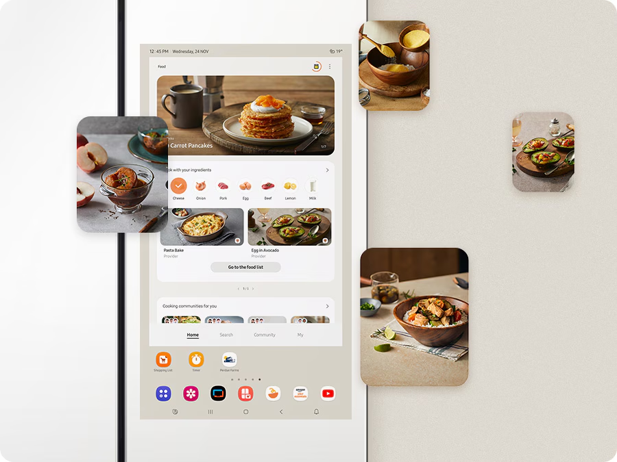 Tận hưởng giải pháp quản lý thực phẩm thông minh. AI Vision Inside** sử dụng camera bên trong* để nhận diện các loại thực phẩm tươi sống được đưa vào và lấy ra khỏi tủ, giúp bạn quản lý danh sách thực phẩm dễ dàng***. Bạn có thể xem hình ảnh thực phẩm đang có trong tủ lạnh, nhận gợi ý công thức nấu ăn hoặc quản lý hạn sử dụng của thực phẩm.