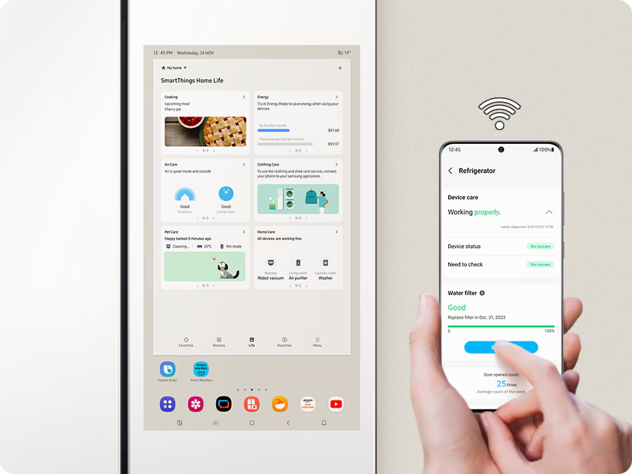 Chia sẻ hình ảnh, để lại ghi chú, giải trí đa phương tiện và điều khiển các thiết bị thông minh được kết nối qua SmartThings* với màn hình AI Family Hub™+ 32 Inch. Bạn cũng có thể dễ dàng quản lý danh sách thực phẩm đang có trong tủ lạnh với tính năng nhận diện thực phẩm AI Vision Inside.