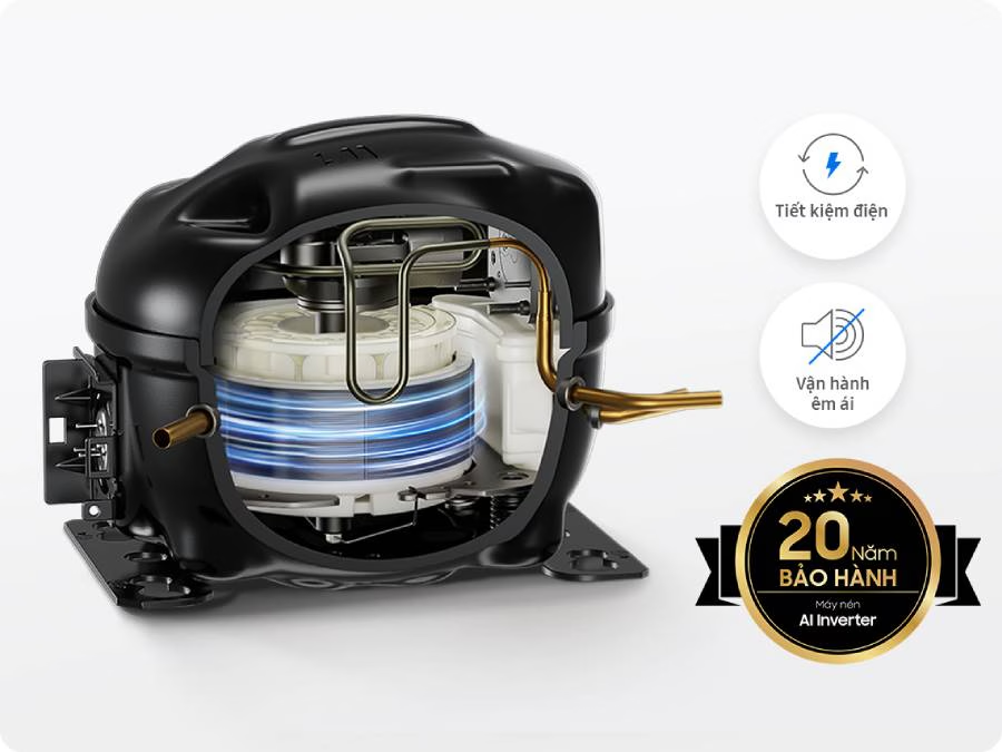 Với cấu trúc được cải tiến, máy nén AI Inverter tăng quán tính đến 4.1 lần, nhờ đó tiêu tốn ít điện năng hơn so với các máy nén thông thường. Dựa theo nhu cầu sử dụng thực tế, máy nén AI Inverter tự động điều chỉnh tốc độ vận hành, giúp tiết kiệm điện tốt hơn, giảm tiếng ồn và kéo dài tuổi thọ máy. Đồng thời máy nén được bảo hành đến 20 năm.