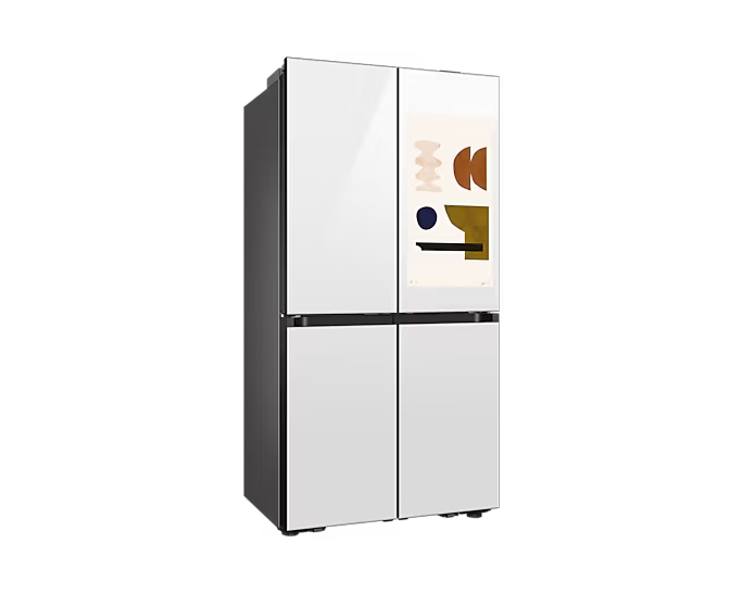Một chiếc tủ lạnh 4 cửa dung tích lớn 636 L, thiết kế Bespoke màu trắng tinh tế, tích hợp màn hình thông minh Family Hub và AI để quản lý thực phẩm, hỗ trợ điều khiển từ xa – phù hợp cho gia đình có nhu cầu lưu trữ đồ nhiều, muốn sự tiện nghi và công nghệ trong bếp.