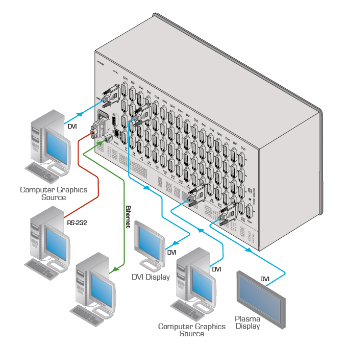 4 to 32 of the following outputs: DVI or HDCP, 1.2Vpp on DVI Molex 24−pin (F) connectors; DDC signal 5Vpp (TTL); HDMI; fiber optic on LC connectors; DGKat on RJ−45 connectors; 2 to 16 DVI dual link, 1.2Vpp on DVI Molex 24−pin (F) connectors