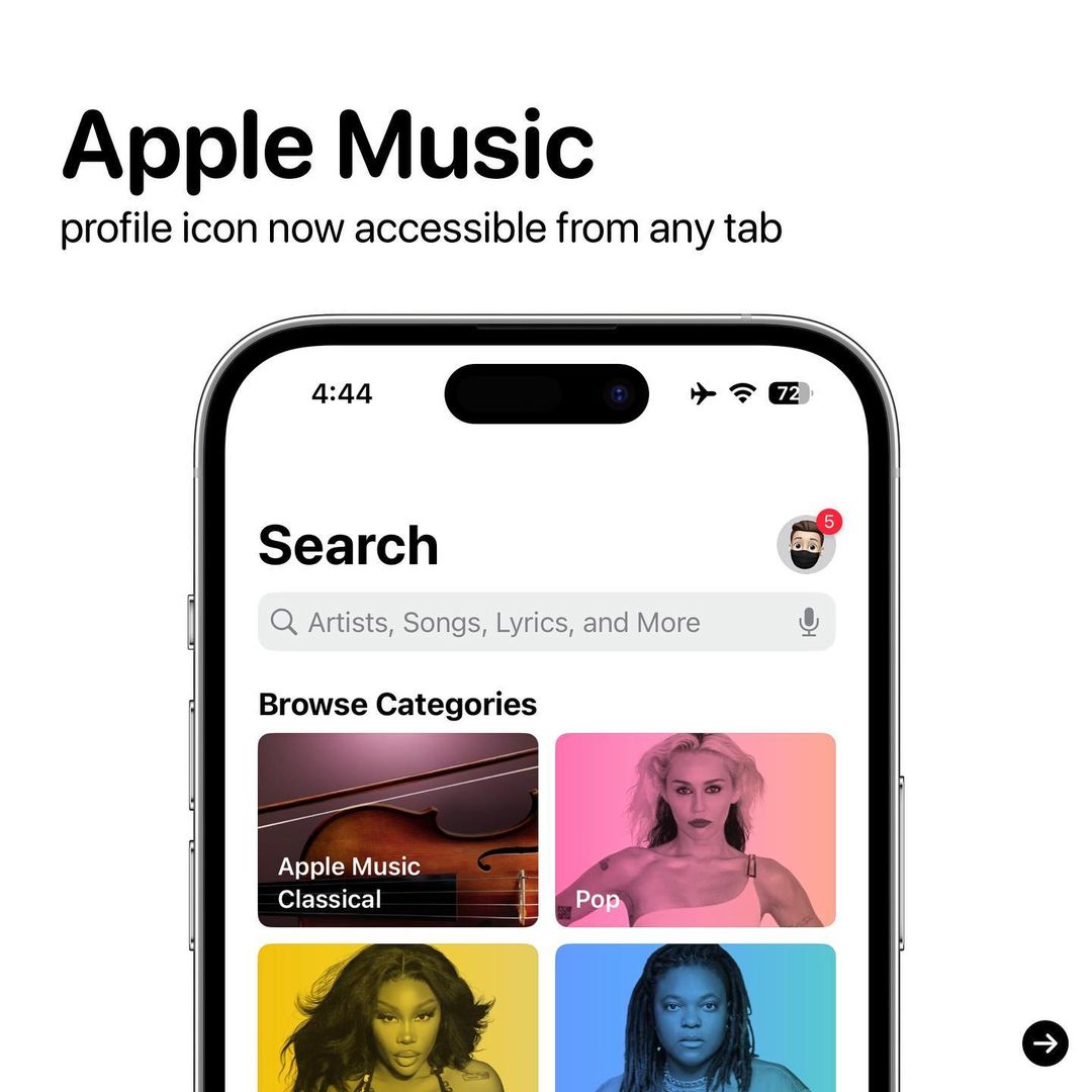 Biểu tượng hồ sơ xuất hiện ở mọi mục trong ứng dụng Apple Music