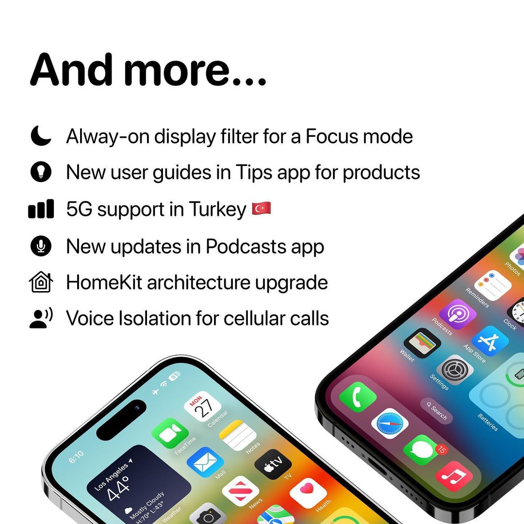 Và một số cập nhật khác: Thêm bộ lọc Alway-on-display cho chế độ Focus, thêm các hướng dẫn cho người dùng mới trong ứng dụng Tips, hỗ trợ 5G cho Thổ Nhĩ Kỳ, cập nhật Podcast, cập nhật cấu trúc mới cho HomeKit, cải thiện đàm thoại…