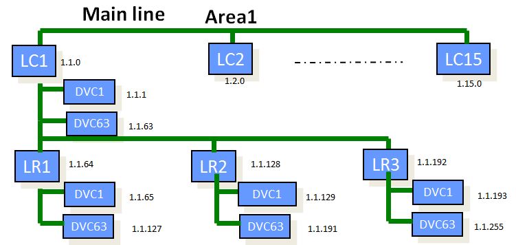 -Tiếp theo trong mỗi khu vực có 15 nhánh(tuyến ) ghép lại với nhau thành với nhau tạo thành mainline ( tuyến chính ), 15 nhánh đó trong mạng KNX được đánh số từ 1.1.0 tới 1.15.0.
