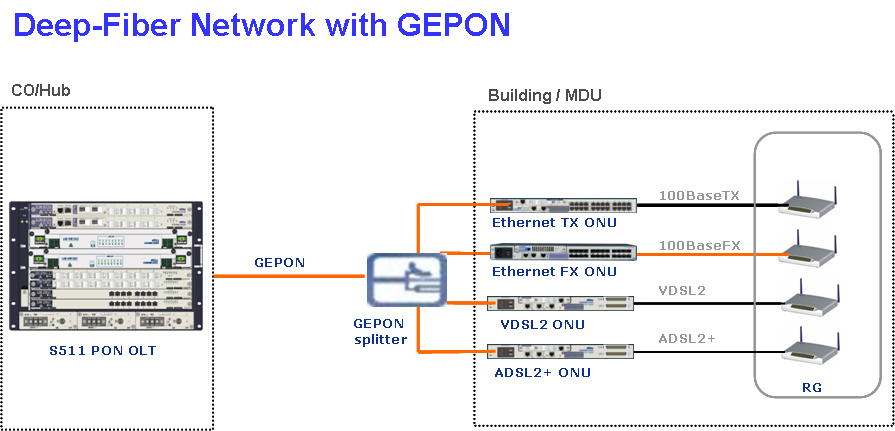 Corecess cung cấp nhiều kết nối quang khác nhau như Gigabit Ethernet, GEPON và đa kênh Gigabit Ethernet sử dụng công nghệ WDM cho mạng Deep-Fiber. Đường GEPON tới R1 làm tăng tính mềm dẻo và kinh tế của mạng truy nhập bằng 4 hoặc 8 kết nối R1 với 1 đường GEPON qua bộ chia thụ động. Đường quang Gigabit WDM PON có thể cung cấp băng thông 16Gbps qua sợi feeder tới các điểm R1, và kết nối trực tiếp tới R1 bằng tốc độ 1Gbps.