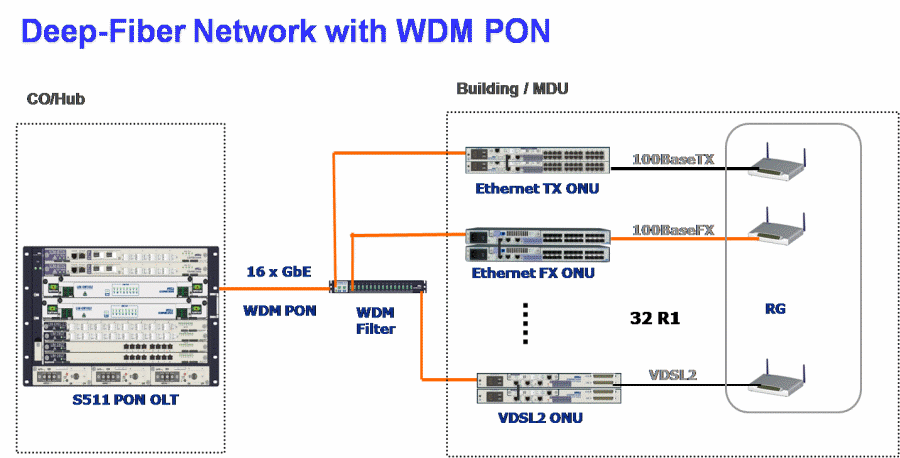 Đường quang Gigabit WDM PON có thể cung cấp băng thông 16Gbps thông qua một sợi feeder nối tới các điểm nơi R1 tồn tài và nối trực tiếp tới R1 với tốc độ 1Gbps. Dùng 2 hoặc 4 R1 để thiết kế sẽ mang đến sự mềm dẻo và vững chắc cho mạng, đồng thời tối thiểu được vốn đầu tư ( CapEx-Capital Expenditures ).