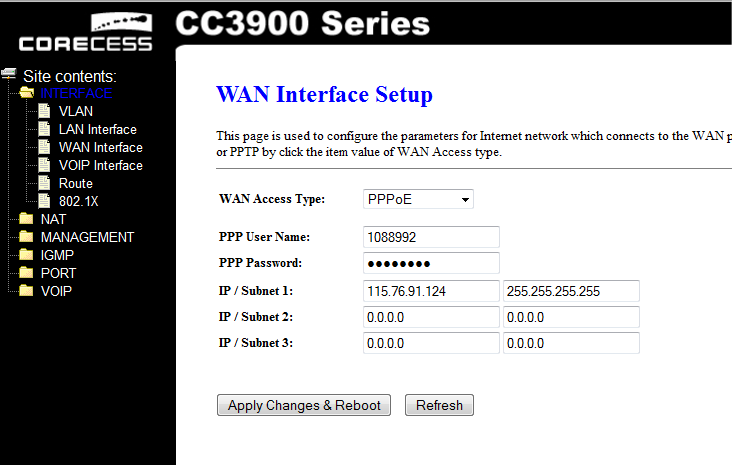 • PPPoE : Vào Interface Wan -> PPPoE ->Nhập Username và password để xác thực -> Apply change& Reboot