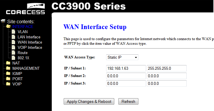 • Static IP : Vào Interface Wan -> Static IP -> Cấu hình IP  trùng với lớp mạng của modem ADSL -> Apply change& Reboot