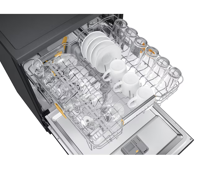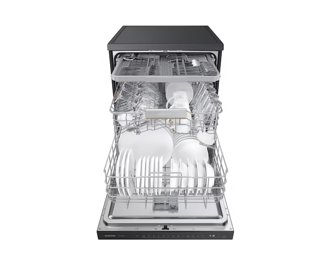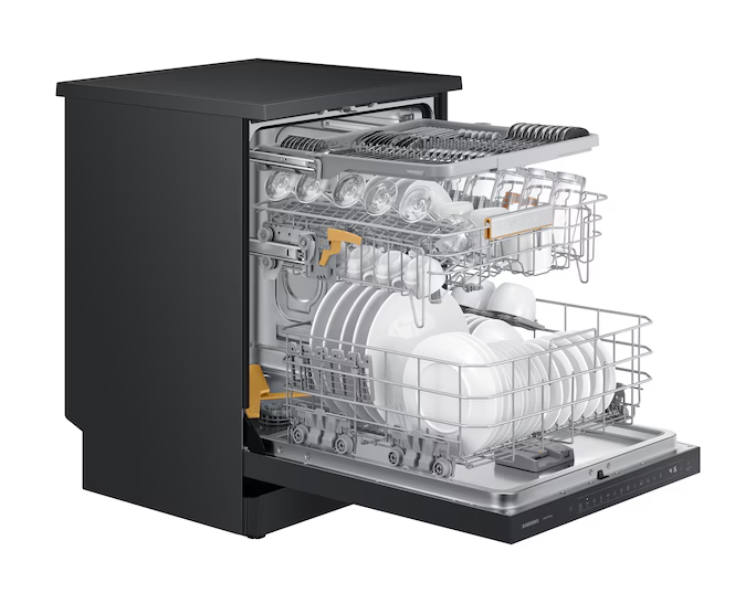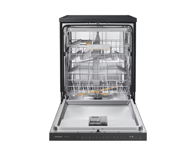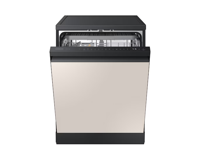 Máy có màu Nâu-Be nổi bật, thiết kế mặt gương sang trọng, tích hợp công nghệ rửa xoáy kép Water Jet Clean™, cửa mở tự động sau khi rửa để sấy khô, cùng kết nối SmartThings để điều khiển từ xa — giúp nhà bếp sạch sẽ, tiện nghi và hiện đại hơn