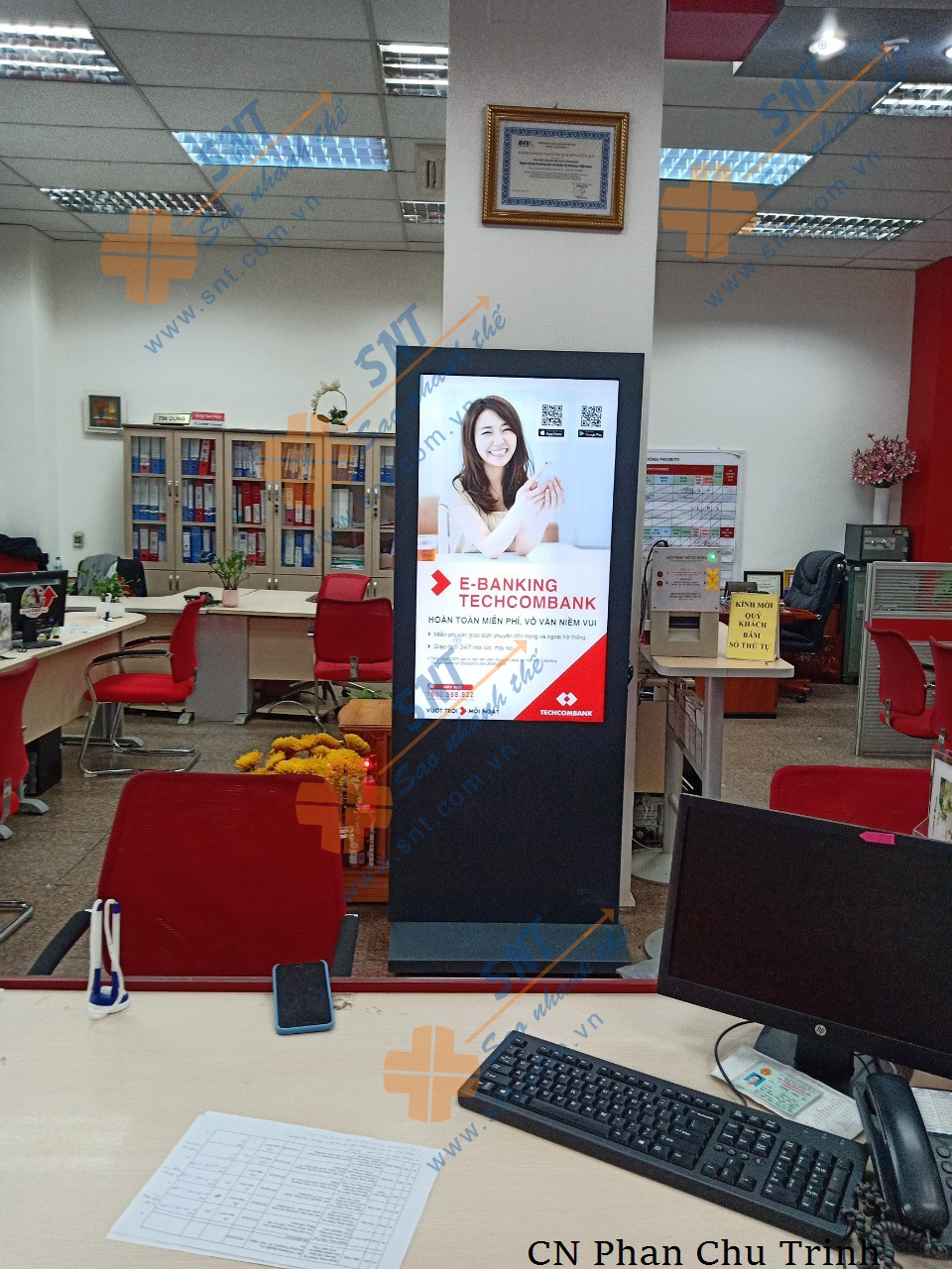 Công ty TNHH Siêu Nhật thanh đã triển khai lắp đặt hệ thống màn hình chuyên dụng hãng LG với chân di động E-Standee theo thiết kế riêng cho Ngân hàng kỹ thương Việt Nam (TCB) với số lượng 200 cái cho các PGD trên toàn quốc.
