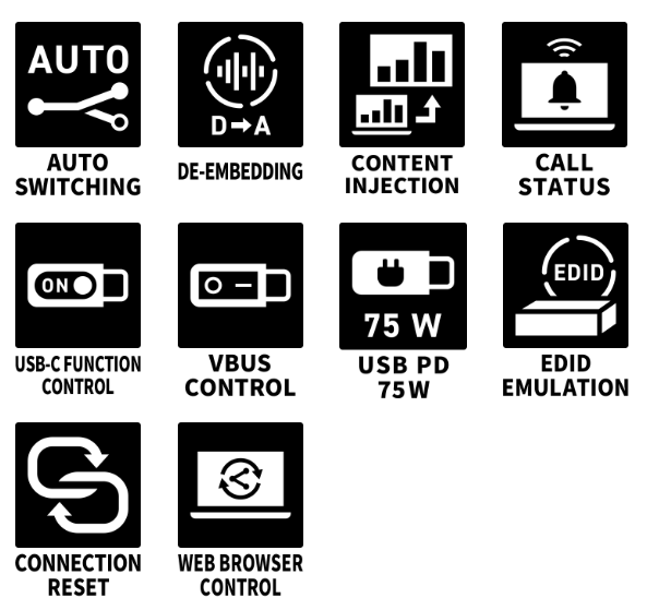 Đối với đầu vào video, bộ chuyển đổi bao gồm một (1) USB-C và hai (2) đầu vào HDMI, một trong số đó có thể được chọn và xuất ra thông qua đầu ra HDMI cục bộ.