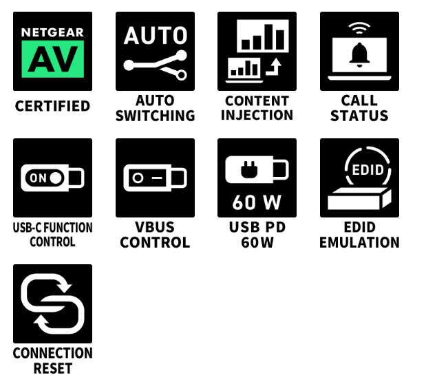 Đối với đầu vào video, bộ mã hóa có một (1) USB-C và một (1) đầu vào HDMI được xuất qua CAT6A (SDVoE) tới bộ giải mã dưới dạng bộ chuyển đổi 2x1. Bộ giải mã bao gồm một (1) đầu vào HDMI, một (1) đầu vào USB-C và một (1) 10GbE CAT (SDVoE), một trong số đó có thể được chọn và xuất ra đầu ra HDMI cục b.