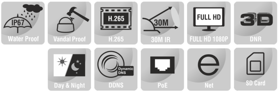 • 2MP IR IP H.265 Vandal Proof Compact Dome camera with 2.8mm Fixed Lens, PoE, SD card slot, Built-in Mic and 30m IR support