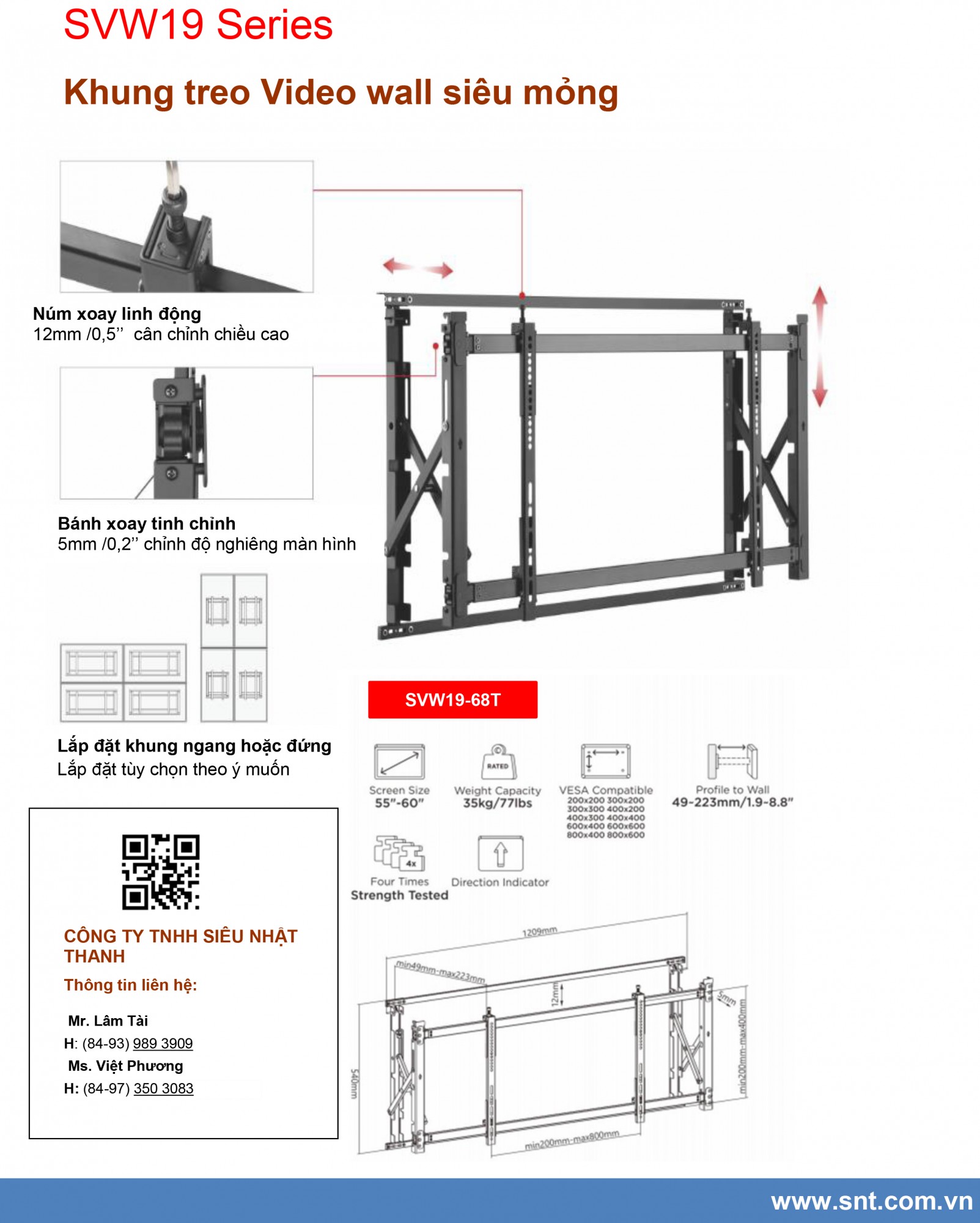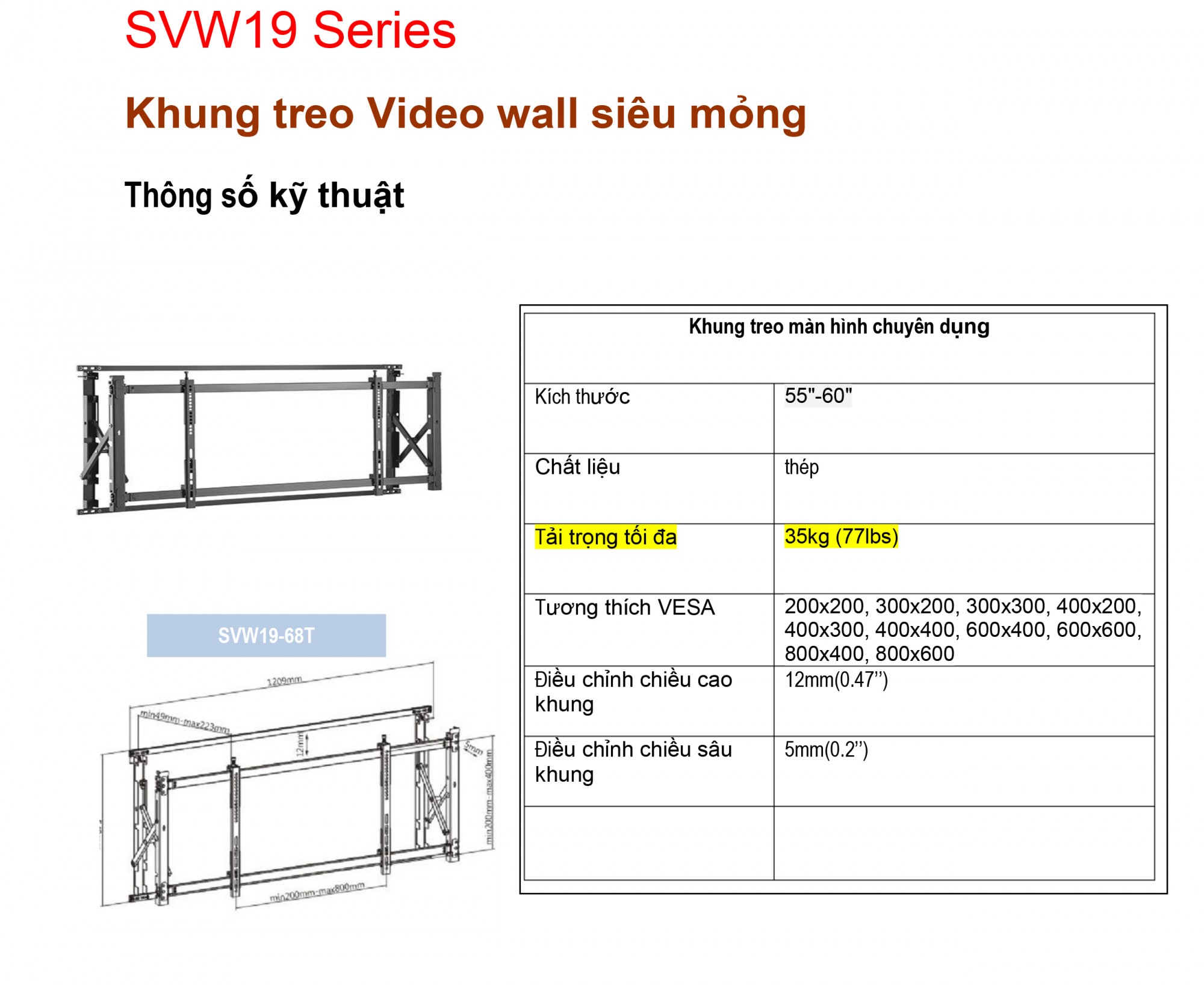Khung treo Video wall siêu mỏng SVW19-68T - Thiết kế thiết kế siêu mỏng - Căn chỉnh Video wall hoàn thiện chính xác - Linh động lắp đặt theo các nhu cầu khác nhau - Thiết kế đơn giản, dễ dàng lắp đặt, điều chỉnh và bảo trì