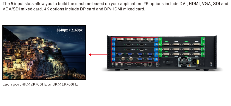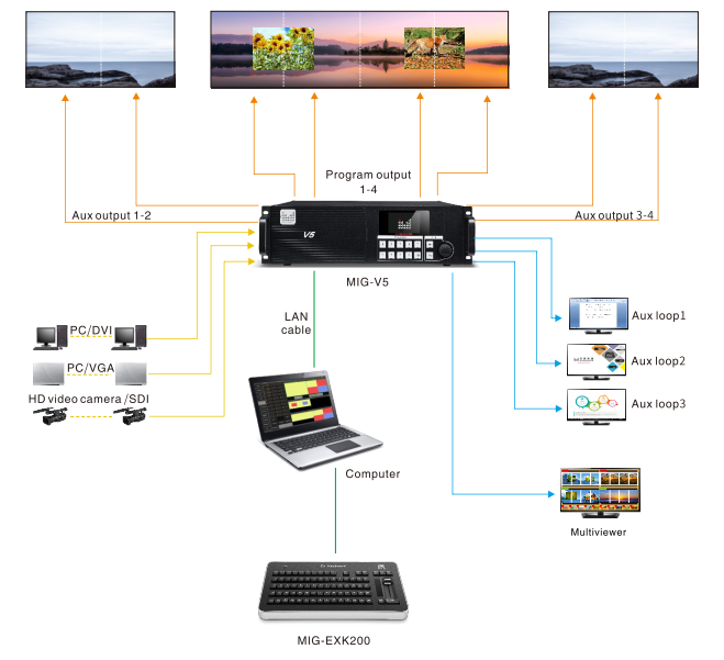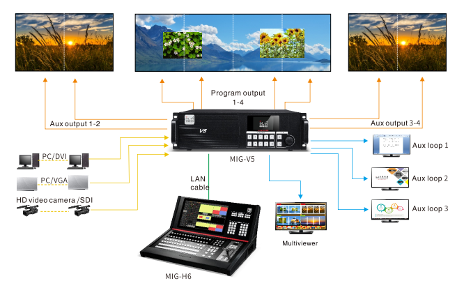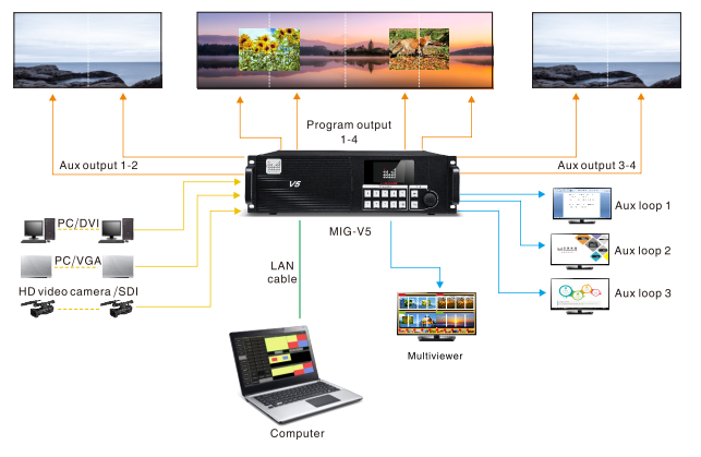 - MIG-V5 hỗ trợ nhiều màn hình nối liền mạch, giúp tín hiệu đầu ra rõ ràng, tinh tế, nhiều màu sắc và đảm bảo tín hiệu đầu ra đồng bộ và không có độ trễ