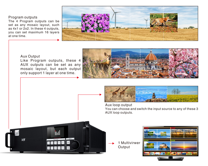 - Xem trước thời gian thực cho tín hiệu đầu vào và đầu ra thông qua đầu ra xem trước nhiều màn hình.