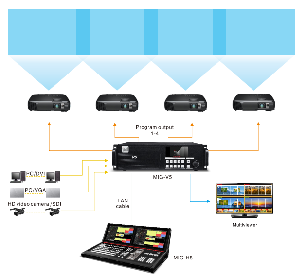 - Hợp tác với các bảng điều khiển như MIG-HS, MIG-H6, nó có thể nhận ra chuyển đổi mờ dần giữa nhiều lớp và cảnh, nó được sử dụng rộng rãi trong triển lãm xe hơi, hội nghị doanh nghiệp và chương trình sân khấu, v.
