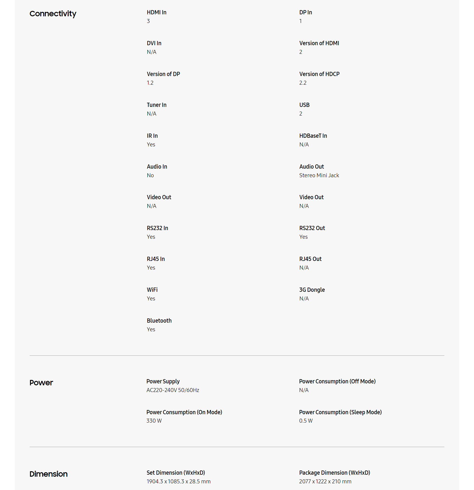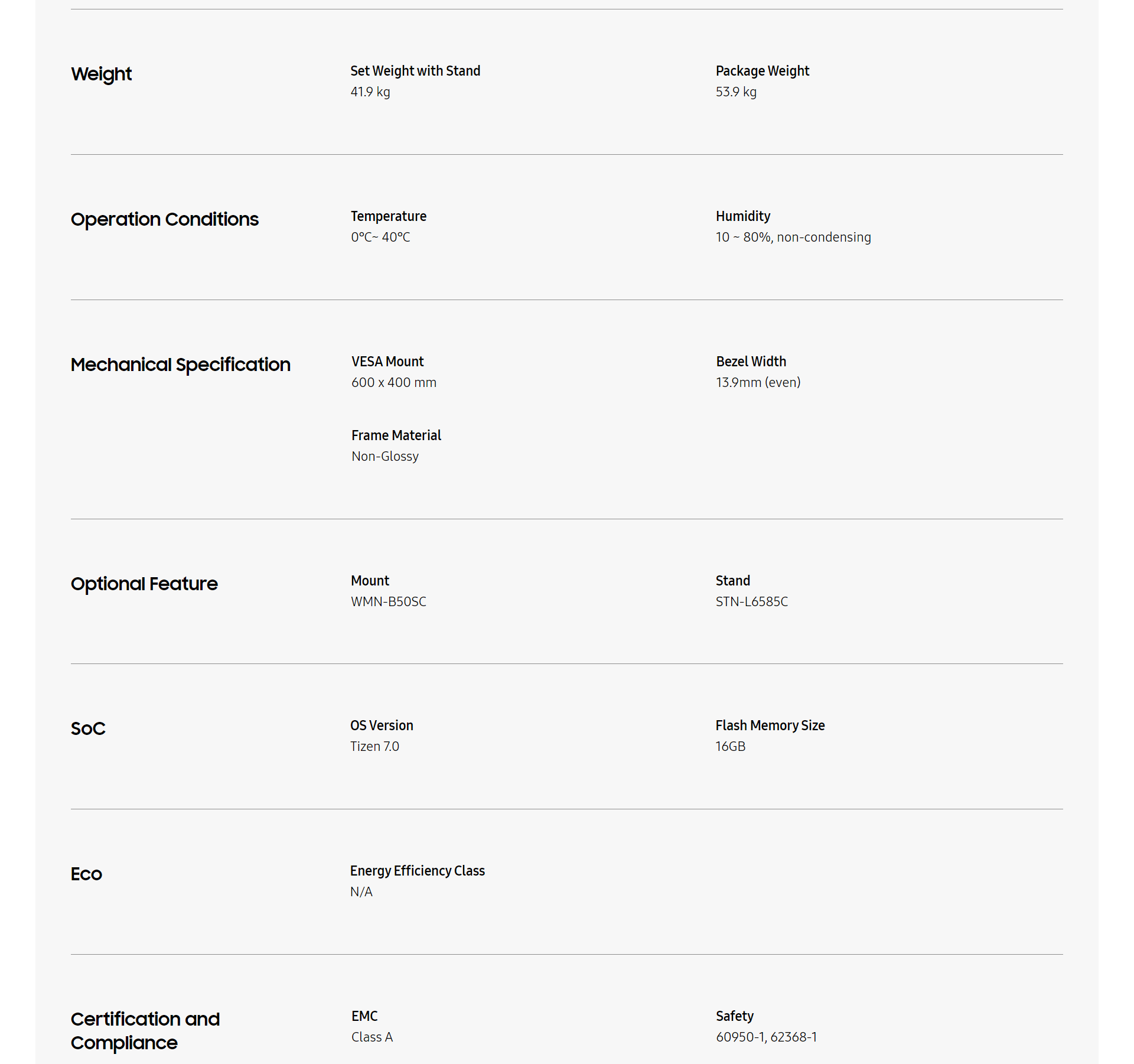 Samsung is making diverse efforts to reduce our environmental impact in smart signage, and encouraging users to pursue a more sustainable life. As a result, QMC series has earned a series of certifications for environmentally preferable products from highly recognised institutes in Germany and the U.S
