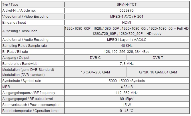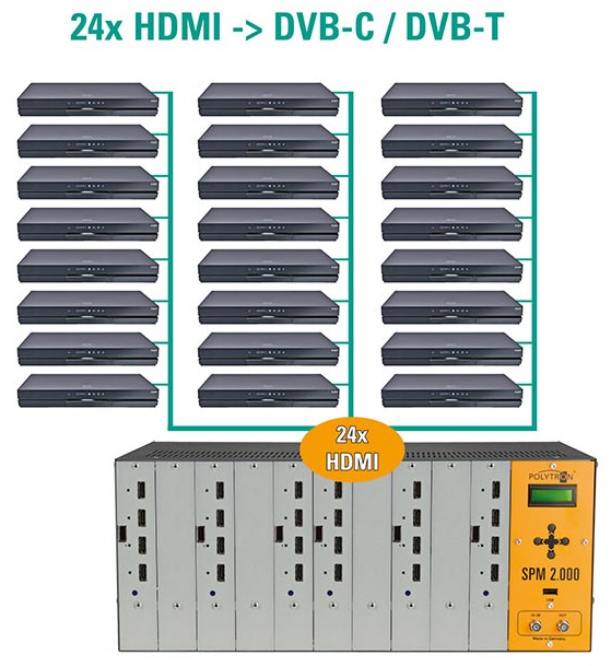Các loại thay đổi của điều chế cho phép việc phân phối các tín hiệu đầu ra thông qua cáp (DVB-C / QAM) hoặc truyền hình mặt đất (DVB-T / COFDM)