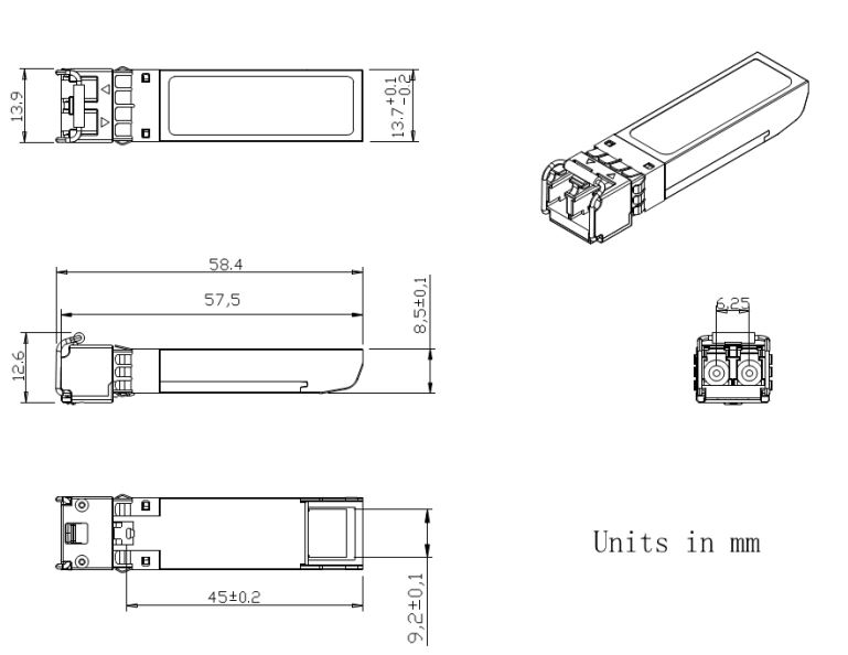 - Up to 11.1Gbps Data Links - Up to 10km transmission on SMF - DFB Laser and PIN receiver - Metal enclosure, for lower EMI - 2-wire interface with integrated Digital Diagnostic monitoring - Hot-pluggable SFP+ footprint - Specifications compliant with SFF 8472 - Compliant with SFP+ MSA with LC connector - Single 3.3V power supply - Power dissipation < 1.2 W - Case operating temperature range: Commercial: 0°C to +70°C - Industrial: -40°C to +85°C