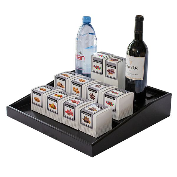 • Angled shelf dividers keep guests from storing personal items inside minibars, reducing spills/excess maintenance and allowances